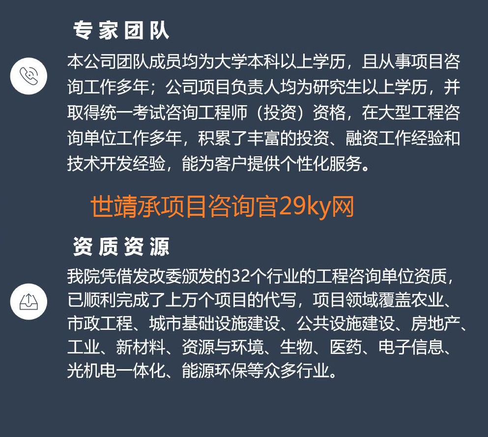 世靖承项目咨询公司主营Z府规划咨询(产业规划)、工程咨询、能评、环评、稳评、评价咨询领域,世靖承项目咨询秉承“携手客户,一起提升价值”的理念,为Z商各界提供高